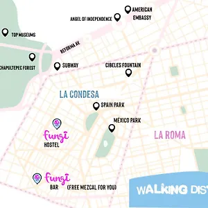 La forêt de Chapultepec se trouve à à une distance de 2 km et l'Ange de l'Indépendance peut être atteint en 5 minutes en voiture de Fungi Hostal Condesa Mexico.